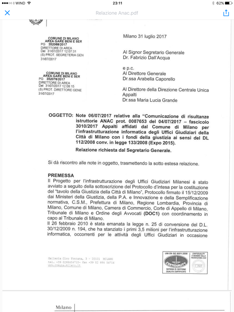 Spiega Fabrizio Dall’Acqua, da poco segretario generale e responsabile anti corruzione dell’amministrazione comunale: “Il compito del Comune di Milano era di tradurre in atti amministrativi le scelte operate dagli Uffici Giudiziari. In caso di affidamenti diretti, l’individuazione del fornitore è stata fatta dagli Uffici Giudiziari e dal Dgsia (articolazione ministeriale, ndr) che avevano contezza dei rapporti pregressi e delle problematiche tecniche sottostanti”.