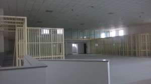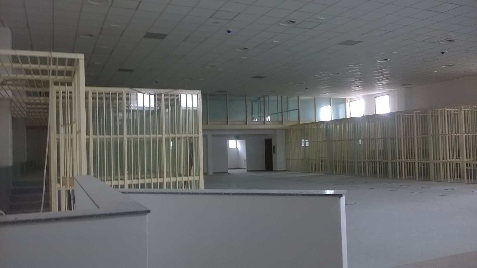 Il progetto iniziale prevedeva due aule di udienza, poi si è deciso di ridurre a una l’aula e destinare gli altri spazi a un grande archivio. Sopra l’aula sono previsti gli alloggi dei giudici, sotto le celle per ‘ospitare’ i detenuti nelle pause dei processi. Ma negli anni è successo di tutto: i soffitti sono crollati, la ruggine ha aggredito le gabbie, la falda acquifera è salita, com’era prevedibile ma non previsto nel piano originario.